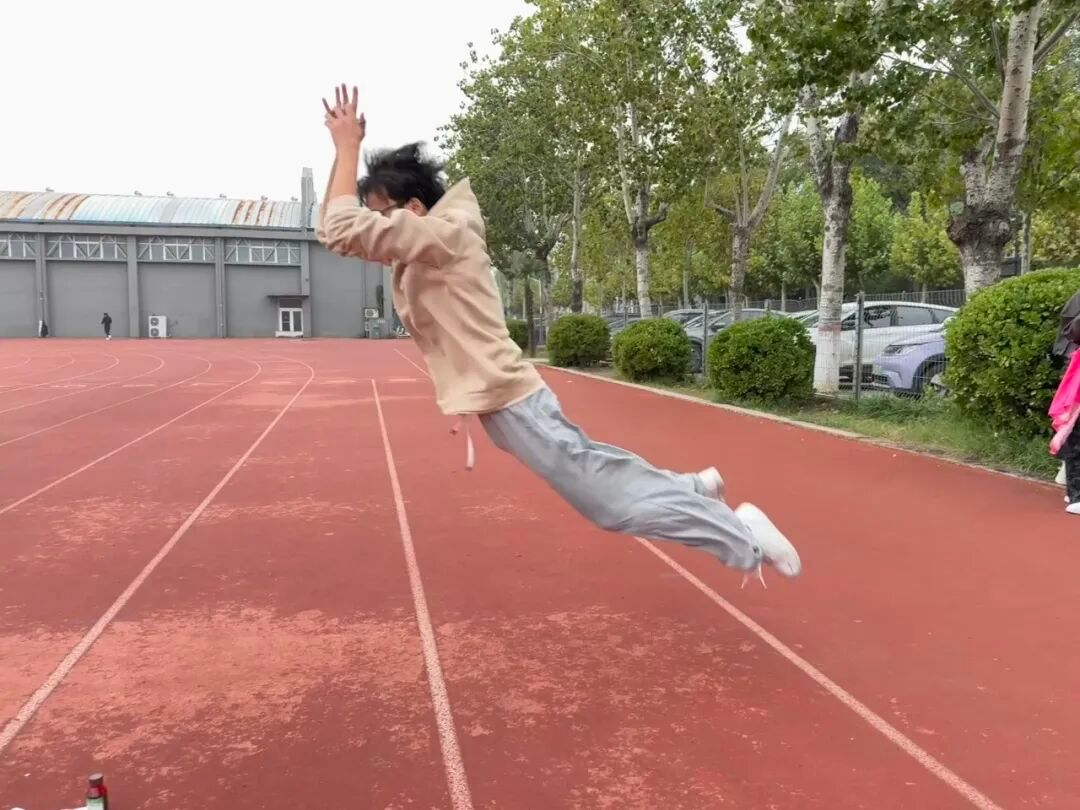 塑胶场地上,男女立定跳远选手奋力起跳,在空中划出优美弧线,挑战极限。
