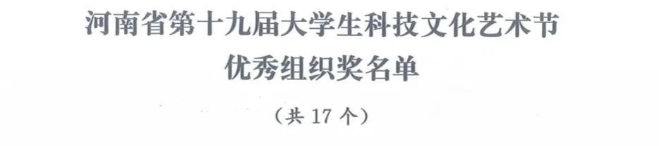 河南省第十九届大学生科技文化艺术节自5月举办以来,以“学习二十大、永远跟党走、奋进新征程”为主题,通过健康向上、丰富多彩的大学生科技文化艺术活动,营造浓厚的校园科技文化氛围,充分展示近两年来我省大学生科技文化活动的丰硕成果,引导当代大学生建功中原,努力成长为社会主义事业的合格建设者和可靠接班人。本次科技文化艺术节中,我院成绩斐然,喜提奖项12项和优秀组织奖,其中10项一等奖,1项二等奖,1项“最佳编导奖”。